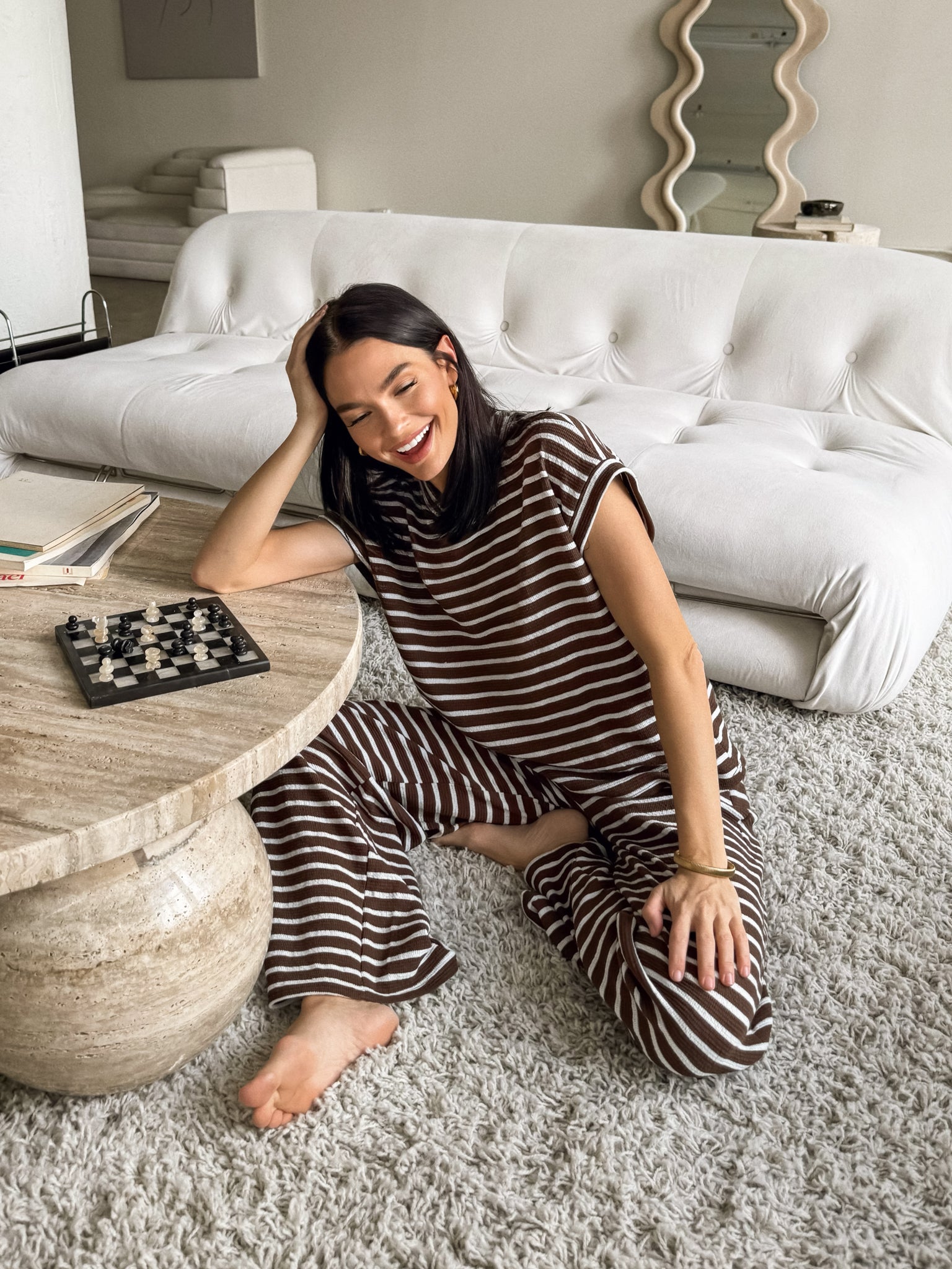 Our New Year’s resolution: wear more stripes. Style our NEW Mocha Stripe Knit Top with our matching pants and uggs for an effortlessly chic look. Pair with a blazer and kitten heel for a more elevated nighttime look!